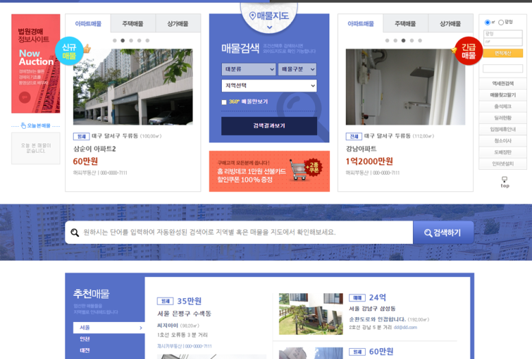 트랜디하게 더 넓어진 디자인으로 눈에 확들어오는 매물정보, 메인 매물지도기능, 다양한 매물검색기능, 각종 유료옵선 선택.관리기능, 딜러별 미니홈페이지 무한생성기능 등 온라인 부동산 중개 사이트 운영에 최적화된 다양한 기능이 장착된 부동산와이드 중개 솔루션 입니다.